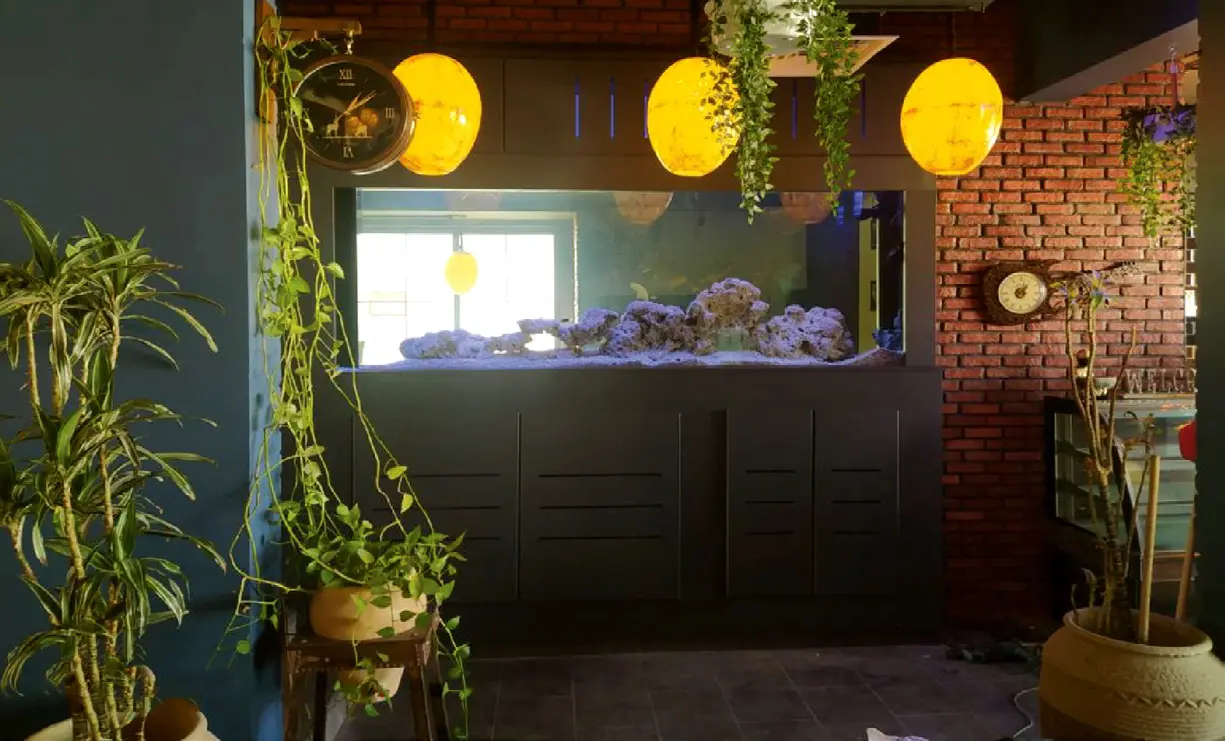 in a room below the aquarium